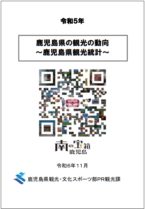 鹿児島県の報告は令和5年度分の宿泊者(延べ宿泊者数),日帰り客(延べ日帰り客数)及び外国人宿泊者(外国人延べ宿泊者数)の動向等について,「宿泊旅行統計」(観光庁)※注1,「観光入込客統計」(観光庁)※注2,「鹿児島県観光動向調査」(鹿児島県)※注3の統計結果や,県内各市町村,関係機関等の御協力を得て実施した観光地点入込状況,交通機関利用状況等の調査をとりまとめたもの。